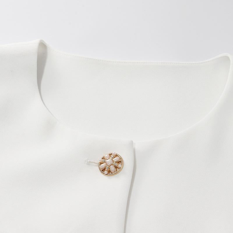 This two-piece suit is made from acetate fabric, offering comfort and breathability. The coordinated design takes the guesswork out of styling, letting you achieve a fashionable look effortlessly. The minimalist design, highlighted by metal buttons, adds a touch of sophistication. Both the top and shorts can be paired separately with other items in your wardrobe, making this set a summer essential.